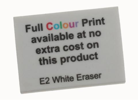E2 White Erasers are manufactured from Thermal Plastic Rubber (TPR). They can be printed with a full colour image and wording if required. They are printed with a flexible ink, which allows for a small percentage of image flex.